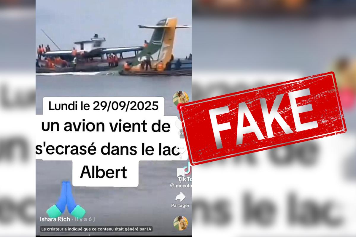 Les images montrent des pêcheurs et des secouristes autour d’une épave partiellement immergée, avec une légende affirmant qu’un appareil transportant 49 passagers s’était écrasé. Après vérification, aucune autorité n’a signalé d’accident en septembre 2025, et d’ailleurs selon André Kataloho Takumara, chef du secteur de Bahema Sud, il s’agit là d’une fausse information. Une recherche d’images inversée via Google Lens a révélé que la vidéo provenait en réalité du crash d’un avion d’Air Tanzania sur le lac Victoria en 2022.