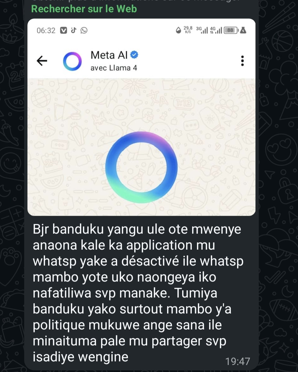 Comme vous l’avez sans doute constaté, un message circule depuis quelques jours dans plusieurs groupes WhatsApp, affirmant que cette bulle flottante serait un logiciel espion. L’expéditeur de ce message anonyme, partagé des milliers de fois, invite même les utilisateurs à désinstaller WhatsApp, prétendant que toute discussion politique serait surveillée dans les zones sous contrôle du M23.