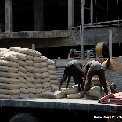 Déchargement des sacs du ciment pour un chantier. Radio Okapi/ Ph. John Bompengo