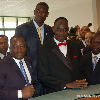 De gauche à droite, le Président Joseph Kabila, Mutombo Dikembe star de NBA, son père biologique, et le Gouverneur de la ville de Kinshasa, André Kimbuta ce 17/07/2007 à Kinshasa, lors de l’inauguration de l’hôpital Biamba Marie Mutombo. Radio Okapi/ Ph.
