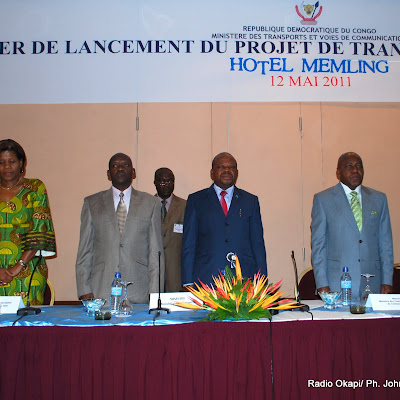 De gauche à droite, la représentante de la Banque Mondiale et quelques membres du gouvernement de la RDC ce 12/05/2011 à Kinshasa, lors de la cérémonie d’ouverture d’atelier de lancement du projet de transport multimodal(PTM). Radio Okapi/ Ph. John Bompengo