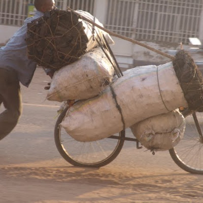 Un commerçant transportant des sacs de braise sur un vélo à Mbuji-Mayi le 17 juin 2011
