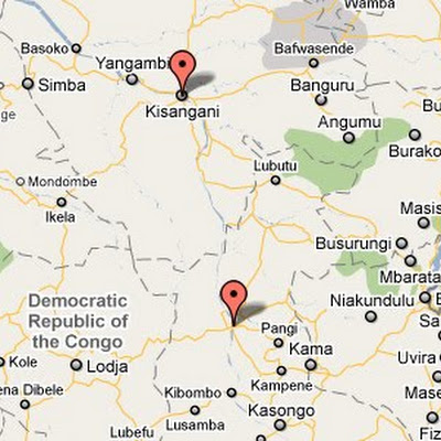 Villes de Kisangani et Kindu, marquées en rouge sur la carte.