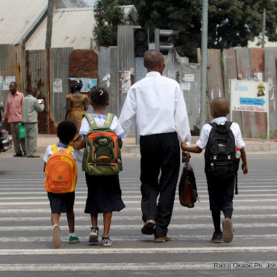Un parent viens de récupérer ses enfants à l’école le 5/9/2011 à Kinshasa, lors de la rentrée scolaire 2011-2012. Radio Okapi/ Ph. John Bompengo