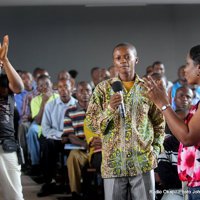 Micro à la main, un des étudiants pose des questions lors de la production de l’émission Okapi Express de la Radio Okapi au campus universitaire de Kinshasa le 30/09/2011.