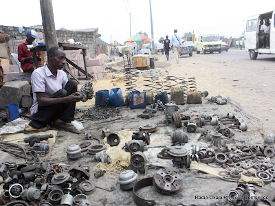 Pa Fioti Kipanga, poliomyélitique gagne sa vie en vendant la mitraille le long de l’avenue des poids lourd à Kingabwa dans la commune de Limeté