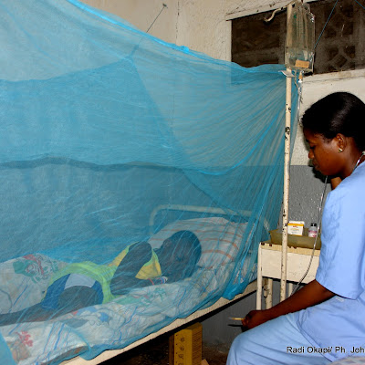 Dans la moustiquaire, un enfant victime de paludisme reçoit des soins auprès d’une infirmière