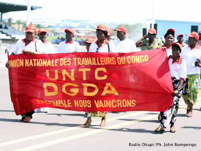 Des membres de l’UNTC défilent ce 01/04/2011 à Kinshasa devant la tribune des officiels, lors de la célébration de la journée internationale de travail. Radio Okapi/Ph. John Bompengo