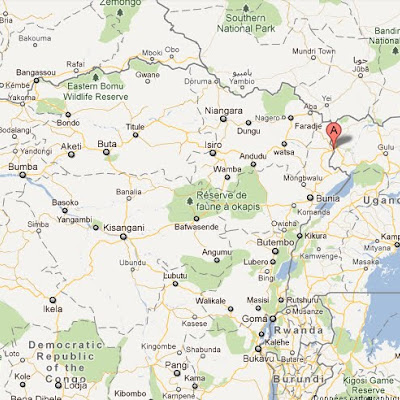 Le point A (en rouge), la localité d’Ariwara, située à environ 300 kilomètres au Nord de Bunia, en territoire d’Aru (Province Orientale/RDC).