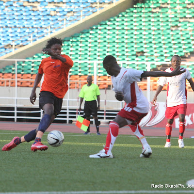 De gauche à droite le joueur de Lupopo avance avec le ballon au pied, aux côtés des ses adversaires de Racine Club de Kinshasa( RCK) ce 2/11/2011 au stade des martyrs à Kinshasa sous les yeux de juge des touches en arrière plan, lors des élimitoires de vodacom super ligue. Ph.
