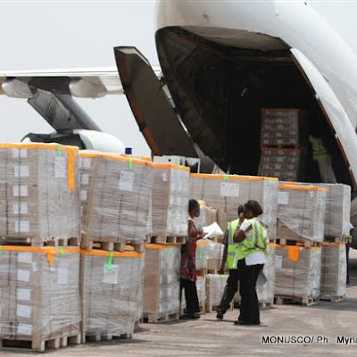 Des agents déchargent des kits électoraux à l’aéroport de N’djili (Kinshasa), le 16/09/2011. MONUSCO/ Ph.