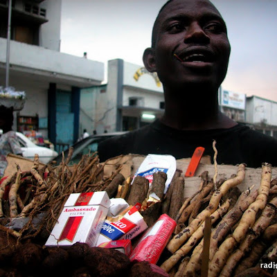 Un vendeur de racines et cigarettes. Kinshasa, 2002.
