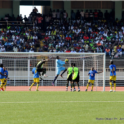 En l’air, en noire l’attaquant de l’A.S.V Club et le gardien de but de Lupopo en bleu ce 22/05/2011 au stade des Martyrs à Kinshasa, lors de Vodacom Super Ligue. Radio Okapi/ Ph. John Bompengo