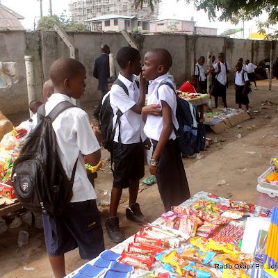 Quelques élèves du collège Boboto observent les articles étalés par les détaillants, le long de la clôture de leur école le 5/9/2011 à Kinshasa, à l’occasion de la rentrée scolaire 2011-2012. Radio Okapi/ Ph. John Bompengo