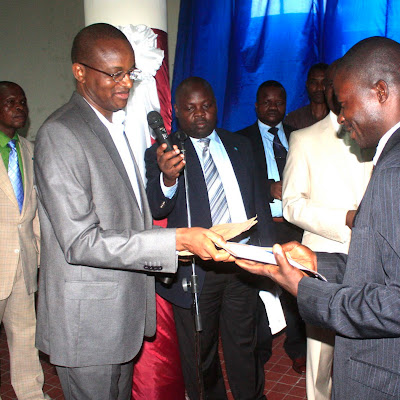 De gauche à droit à l’avant plan : Macker Muangu,ministre de l’EPSP remet officiellement un diplôme d’Etat à un des lauréats aux examens d’Etat édition 2006 ce 3/3/2006 à Kinshasa.