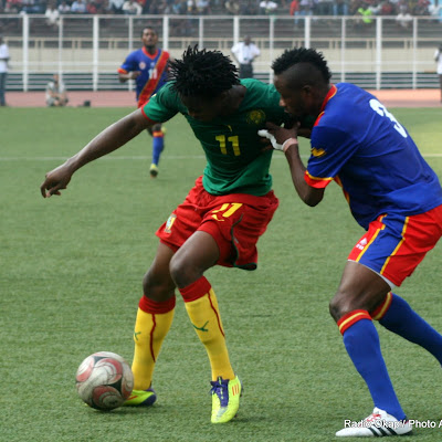Les léopards de la RDC ( rouge-bleu) contre Les lions indomptables du Cameroun(vert-rouge) le 7/10/2011 au stade des martyrs à Kinshasa, score :2-3. Radio Okapi/ Ph.
