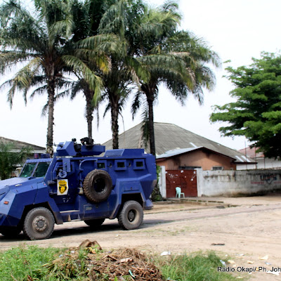 La police anti-émeute devant le siège de l’UDPS le 12/12/2011 à Kinshasa-Limete, après de la dispersion d’un rassemblement des partisans de ce parti. Radio Okapi/ Ph. John Bompengo