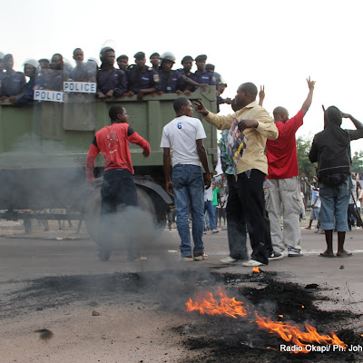 Un véhicule de Fardc passe avec des éléments de la PNC devant des partisans de l’UDPS le 26/11/2011 le long du boulevard Lumumba à Kinshasa, lors de l’arrivé d’Etienne Tshisekedi en provenance du Bas-Congo. Radio okapi/ Ph. John Bompengo