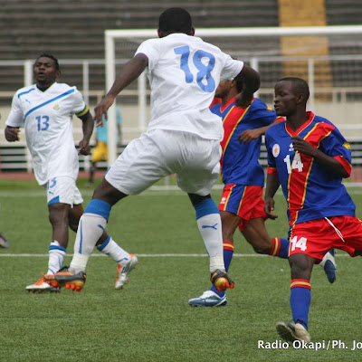 En blanc, des joueurs gabonais en action avec des joueurs congolais (en bleu rouge), ce 30/04/2011 au stade des martyrs de Kinshasa, lors des éliminatoires des jeux africains Maputo 2011 (RDC 1 – Gabon 0).