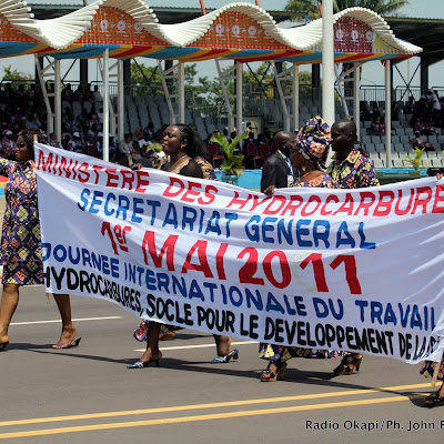Des travailleurs du ministère des hydrocarbures de la RDC défilent ce 01/04/2011 à Kinshasa devant la tribune des officiels, lors de la célébration de la journée internationale de travail. Radio Okapi/Ph.