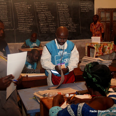 Dépouillement des bulletins de vote pour des candidats aux élections de 2011 en RDC, en présence des temoins le 28/11/2011 à Kinshasa. Radio Okapi/ Ph.