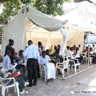 Sous la tante des Nations Unies, des démandeurs d’emploi préparent leurs dossier ce 5/5/2011 à Kinshasa, lors de la foire de l’emploi organisée par la MONUSCO.