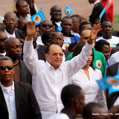 Au centre (chemise blanche), Léon Kengo Wa Dondo saluant le publique ce 24/07/2011 au stade des martyrs à Kinshasa, lors de la sortie officielle de son parti politique UFC. Radio Okapi/ Ph. John Bompengo.
