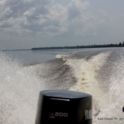Moteur hors bord d’une pirogue flottant sur le fleuve Congo. Radio Okapi/ Ph. John Bompengo