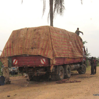 Véhicule transportant du bois coupé illégalement sur l’axe Mambasa-Beni, Ituri, 2006.