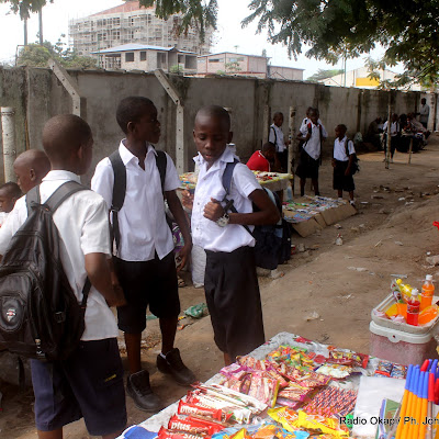 Quelques élèves du collège Boboto observent les articles étalés par les détaillants, le long de la clôture de leur école le 5/9/2011 à Kinshasa, à l’occasion de la rentrée scolaire 2011-2012. Radio Okapi/ Ph. John Bompengo