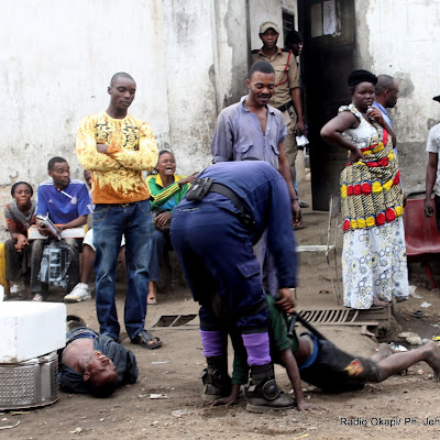 En avant plan au sol, deux adolescents victimes de la torture d’un élément de la Pnc. Radio Okapi/ Ph. John Bompengo
