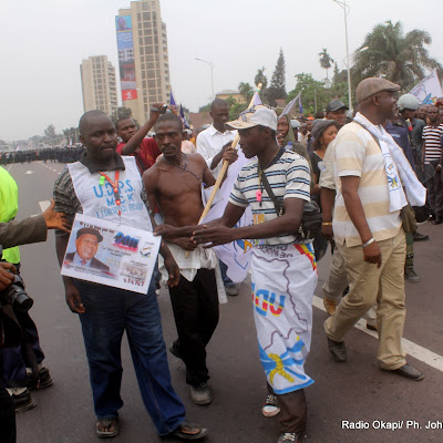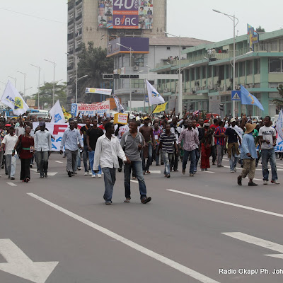 Les partisans de l’opposition marchent sur une des avenues principale de Kinshasa le 1/9/2011, pour la révision du fichier électoral. Radio Okapi/ Ph. John Bompengo