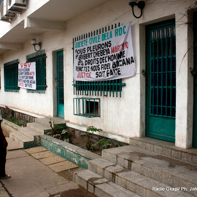 Un homme lisant une banderole devant le siège de lONG, la Voix des Sans-Voix (VSV), à Kinshasa. Radio Okapi/ Ph.