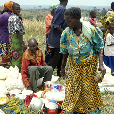Des familles autours des vivres distribués par le Programme Alimentaire Mondial(PAM) ce 1/01/2003 dans le Camp des déplacés à Geti en RDC, lors de la visite de Jan Egland, Secrétaire générale des Nations Unies en charge des affaires Humanitaire. Radio Okapi/ Ph.