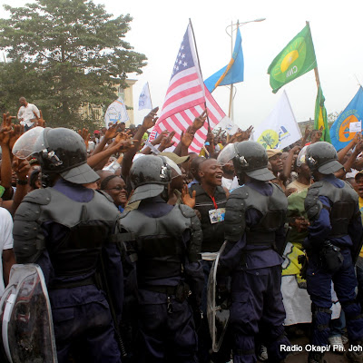La police encadre les partisans de l’UDPS le 5/9/2011 à Kinshasa, lors du dépôt de la candidature d’Etienne Tshisekedi pour la présidentielle 2011, le 5/09/2011 au bureau de réception, traitement des candidatures et accréditation des témoins et observateurs de la Ceni à Kinshasa. Radio Okapi/ Ph.