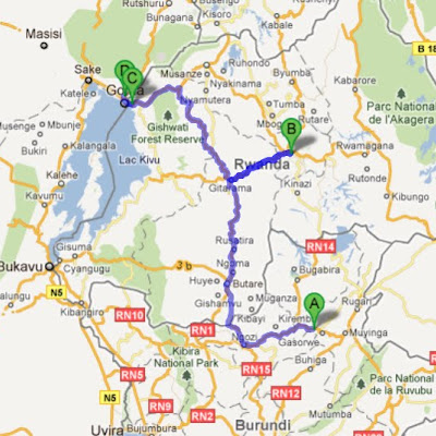 Le point A en vert la Ruzizi au Burundi, le point B, Kigali et le point C, Gisenyi au Rwanda et le point D, Goma.