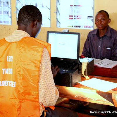 En avant plan, un operateur de la CENI entrain d’enregistrer un homme venu pour obtenir une nouvelle cartre d’électeur ce 7/05/2011 à Kinshasa. Radio Okapi/ Ph.