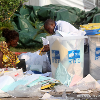Classements des bulletins et des urnes par des agents électoraux le 2/12/2011 au centre de compilation à l’enceinte de la foire internationale de Kinshasa, des élections de 2011 en RDC. Radio Okapi/ Ph.