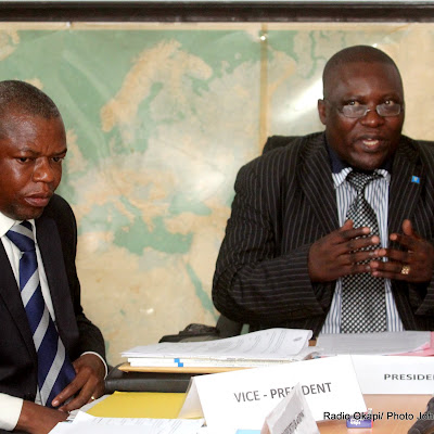 De gauche à droite, le vice président du Csac, Alain Nkoy et le président du Csac, Abbé Jean Bosco Bahala Okw’ Ibale, lors d’une conférence de presse le 28/09/2011 à Kinshasa. Radio Okapi/ Ph.