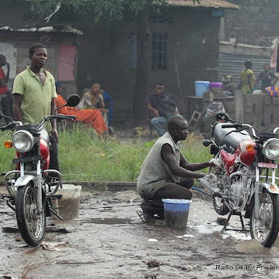 Limete, Avenue des Poids Lourds. Le phénomène Taxi-moto a généré un nouveau job : laveur de moto. Avec 500 FC, un motard peut avoir sa moto pomponnée par un laveur. Jules, (debout sur la photo) arrive sur son lieu de travail tous les jours à 6 heures du matin. Ses recettes journalières s’élèvent à 10 000 FC (environ 11 USD).