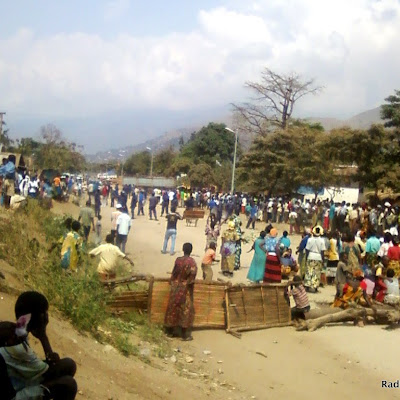 Des commerçants de Kasenga (Uvira, Sud-Kivu) barricadant l’artére principale qui mène vers Bukavu et Bujumbura tôt ce matin (15/06/2011).