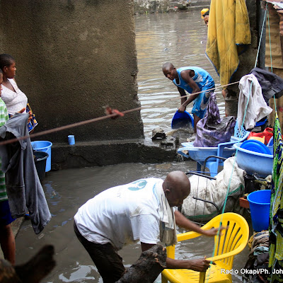 Une famille inondée par les eaux de pluie, tente de récupérer leurs biens en évacuant les eaux stagnantes dans la parcelle. Radio Okapi/Ph. John Bompengo