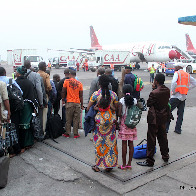 Quelques passagers ce 29/06/2011 à l’aéroport international de Ndjili à Kinshasa pour embarquement vers Lubumbashi à bord d’un Airbus A320 de la CAA. Radio Okapi/ Ph.