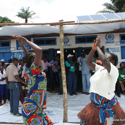 Des femmes dansant lors de la cérémonie du lancement de la Radio Communautaire de Dongo (RACODO ). Ph. Celine