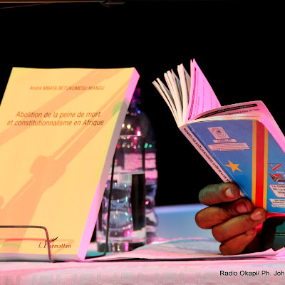 André Mbata Betukumesu Mangu, auteur du livre sur l’abolition de la peine de mort et le constitutionnalisme en Afrique, lu la constitution de la RDC lors de la présentation de son ouvrage le 11/10/2011 à Kinshasa. Radio Okapi/ Ph.