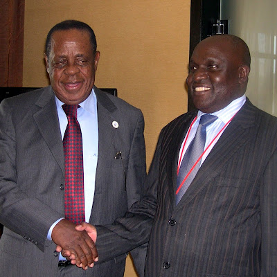 Charles Mwando Nsimba, ministre congolais de la Défense et des Anciens combattants et son homologue ougandais Charles Kiyonga, 15/12/2011, à l’hotel Munyonyo resort à Kampala