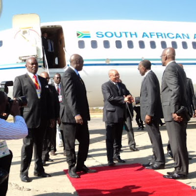 Le président Jacob Zuma accueilli à sa descente d’avion par le ministre congolais de la coopération internationale et régionale, 3e de droite à gauche