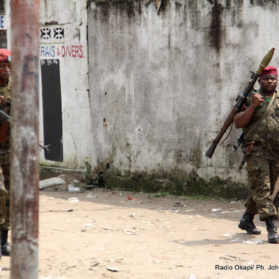Des gardes républicaines dispersent des manifestants le 10/12/2011 sur une des avenues du quartier Kingabwa à Kinshasa. Radio Okapi/ Ph. John Bompengo