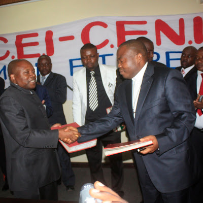 De gauche à droite Abbé Apolinaire Malu Malu et le Pasteur Ngoy Mulunda, en poignet des mains, s’échangeant des documents lors de la remise et reprise Cei-Ceni ce 3/3/2011