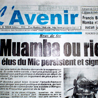 La une du journal L’avenir, ce 20/04/2011 à Kinshasa. Radio Photo/Ph.